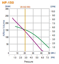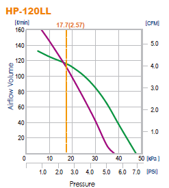 As you can see in the HP-150 graph below, the airflow at 4 PSI is well over 120 LPM. The HP-150 Pond Aeration Kit is the right choice.
