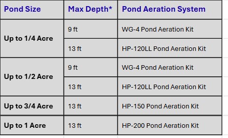 Below is a generic sizing chart for ponds up to 1 acre. However, every pond is different, and shape is a major factor. We encourage you to continue reading to determine the best-sized pond aeration system for your pond.